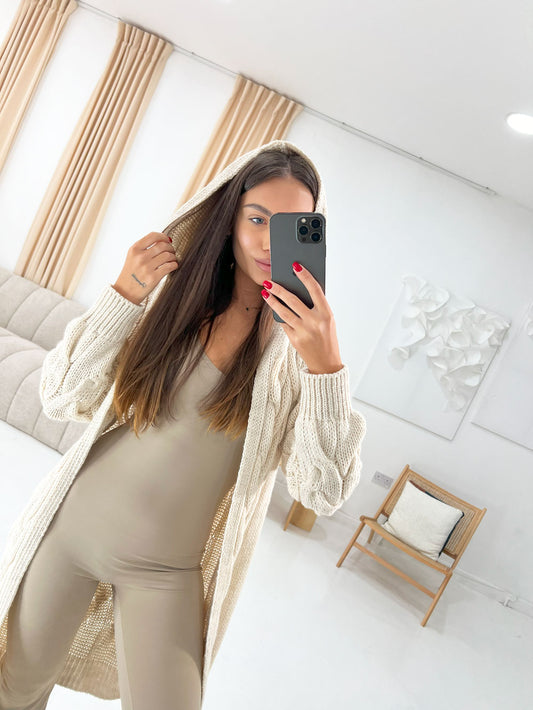 CABLE KNIT HOODED MIDI SWEATER CARDIGAN